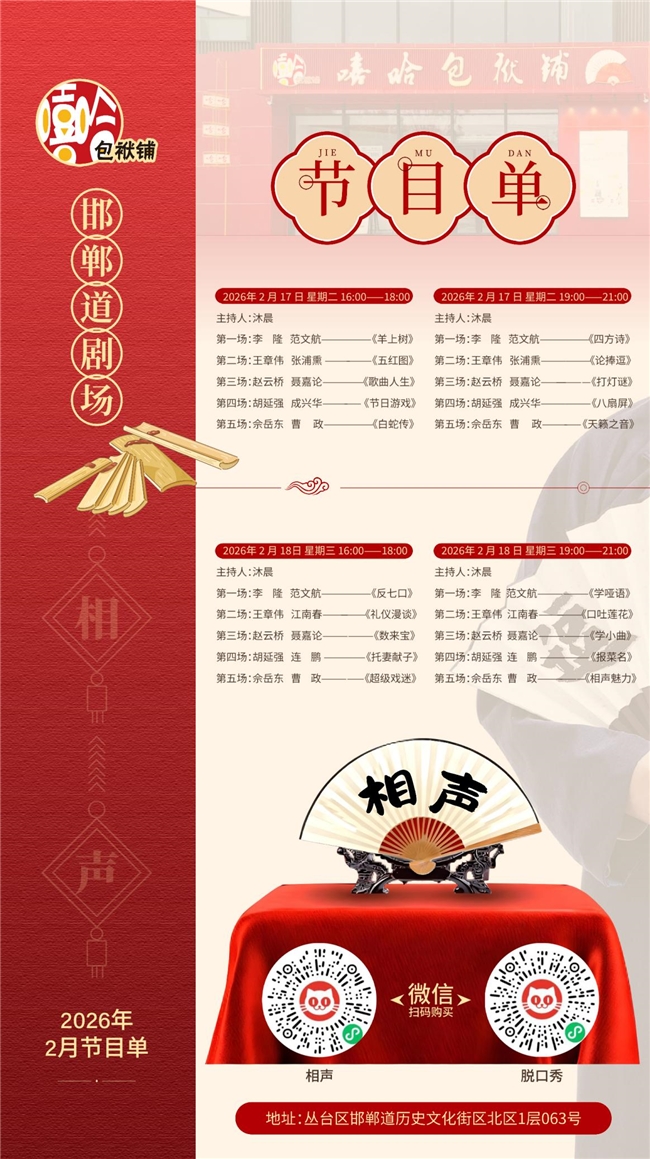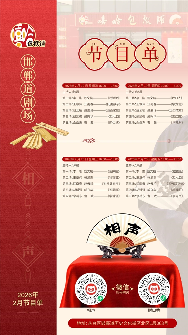 新春启序,喜乐相逢!当邯郸道的年味渐浓,当团圆的期盼升温,嘻哈包袱铺邯郸道剧场携新春专场重磅登场,以笑为礼,陪您共度一个热闹红火、喜乐绵长的团圆年!